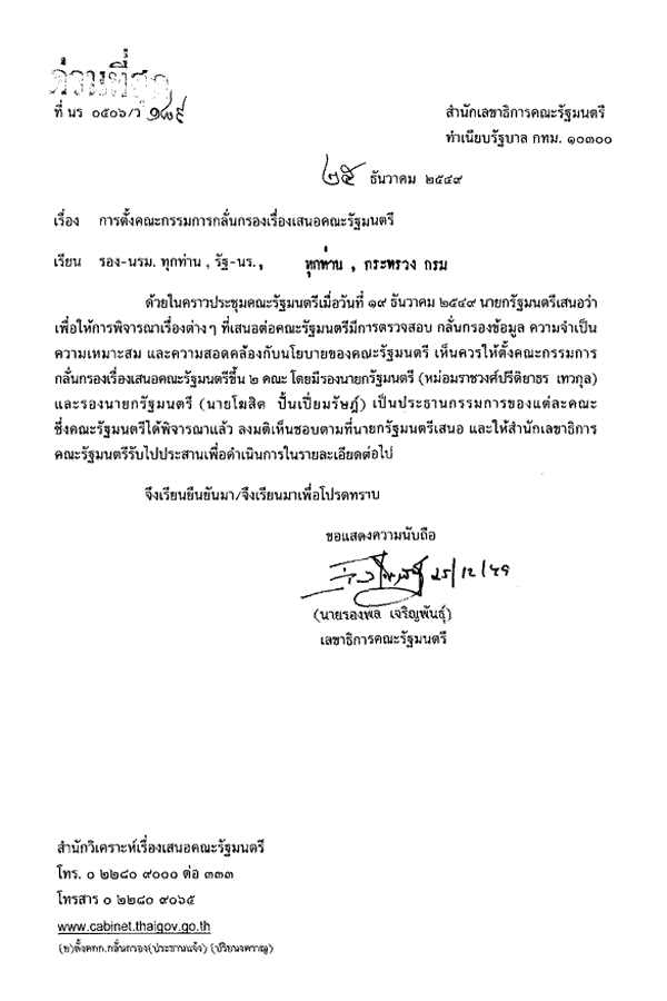 การแต่งตั้งคณะกรรมการกลั่นกรองเรื่องเสนอคณะรัฐมนตรี