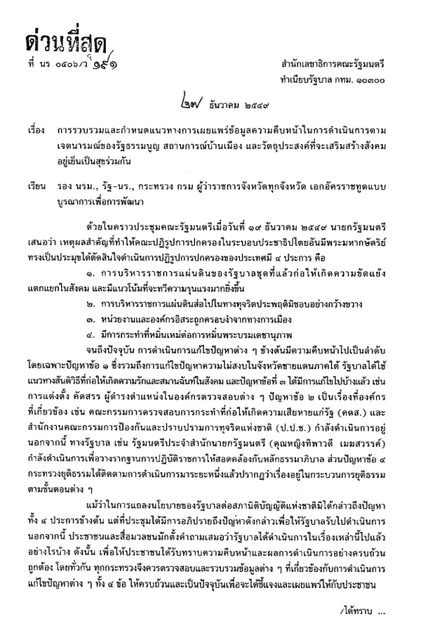 การรวบรวมและกำหนดแนวทางการเผยแพร่ข้อมูลความคืบหน้าในการดำเนินการตามเจตนารมณ์ของรัฐธรรมนูญ สถานกรณ์บ้านเมือง และวัตถุประสงค์ที่จะเสริมสร้างสังคมอยู่เย็นเป็นสุขร่วมกัน