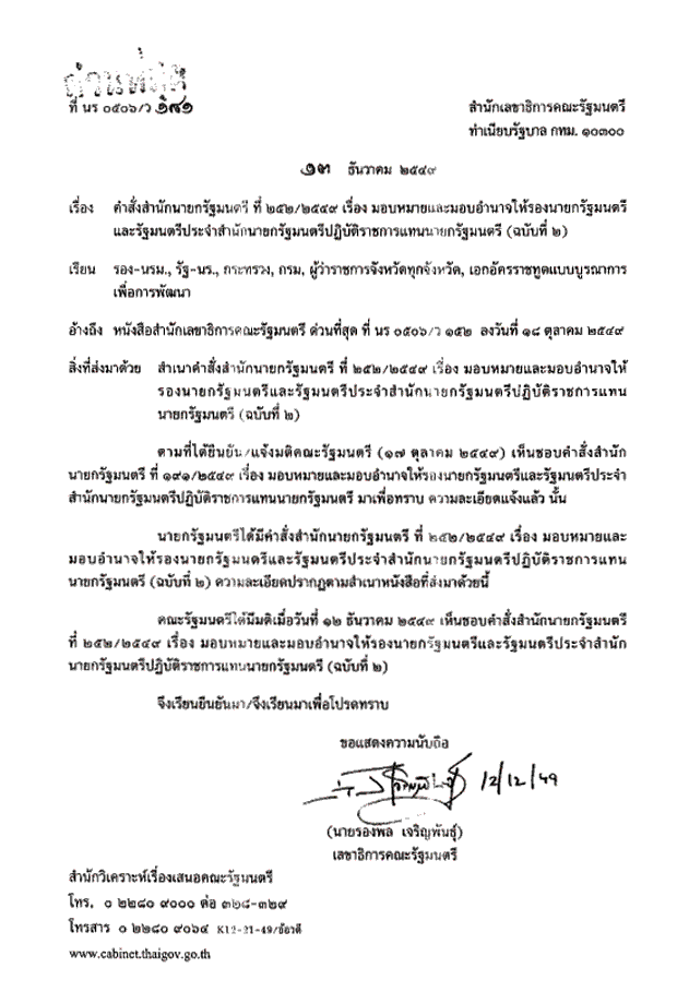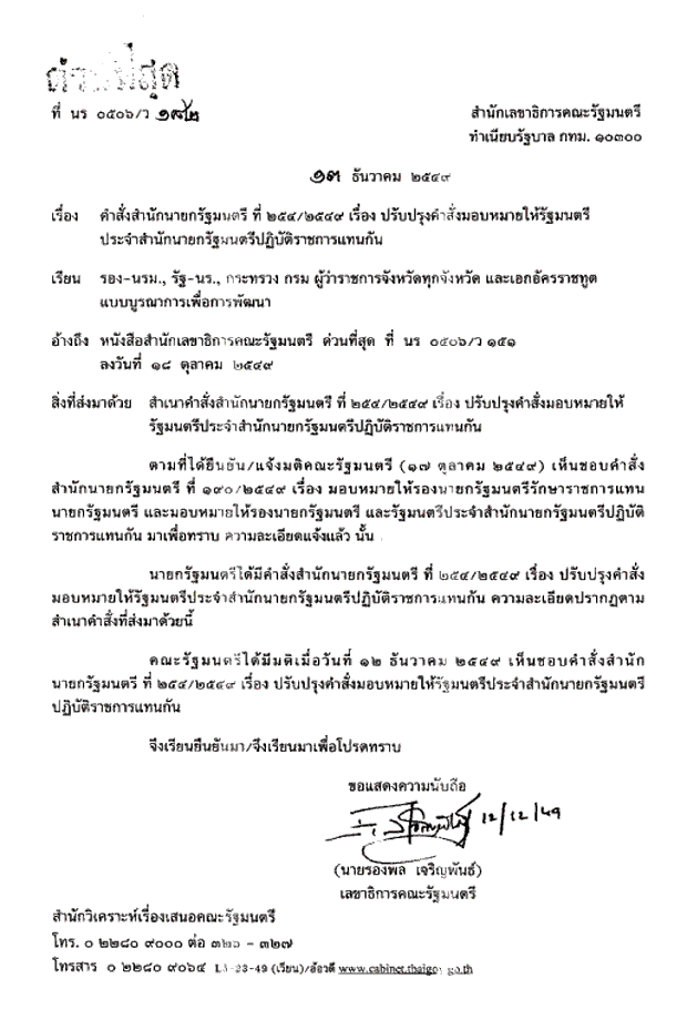 คำสั่งสำนักนายกรัฐมนตรีที่ 254/2549 เรื่องปรับปรุงคำสั่งมอบหมายให้รัฐมนตรีประจำสำนักนายกรัฐมนตรีปฏิบัตราชการแทน